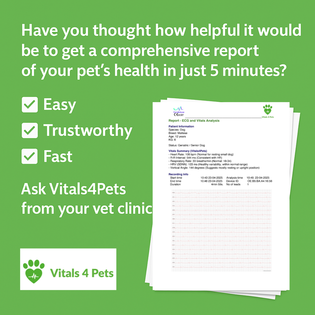 With Vitals4Pets, your vet can provide a comprehensive 7-page report on your pet’s overall wellbeing, including detailed insights into their heart health.